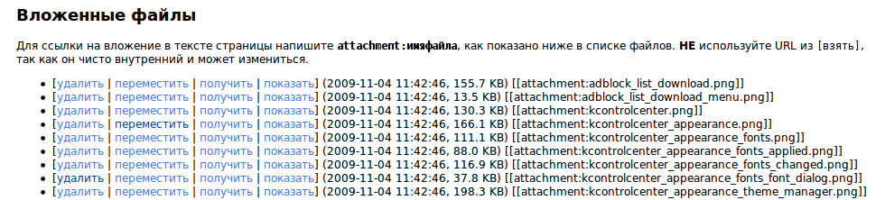 To refer to attachments on a page, use attachment:filename, as shown below in the list of files. Do NOT use the URL of the [get] link, since this is subject to change and can break easily.- [get | view] (2013-03-17 17:17:40, 10.3 KB) [[attachment:move_example2.png]]